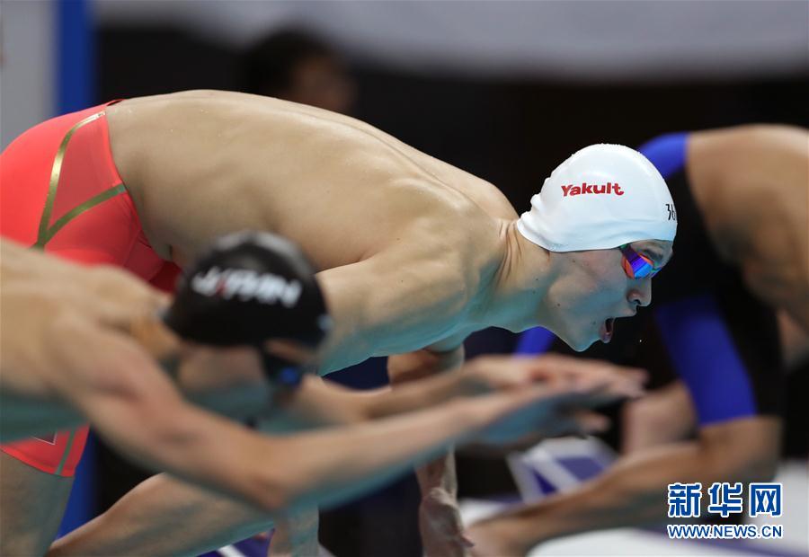 8月20日,中国选手孙杨在比赛中入水。 当日,第18届亚运会男子800米自由泳决赛在雅加达举行。 新华社记者费茂华摄