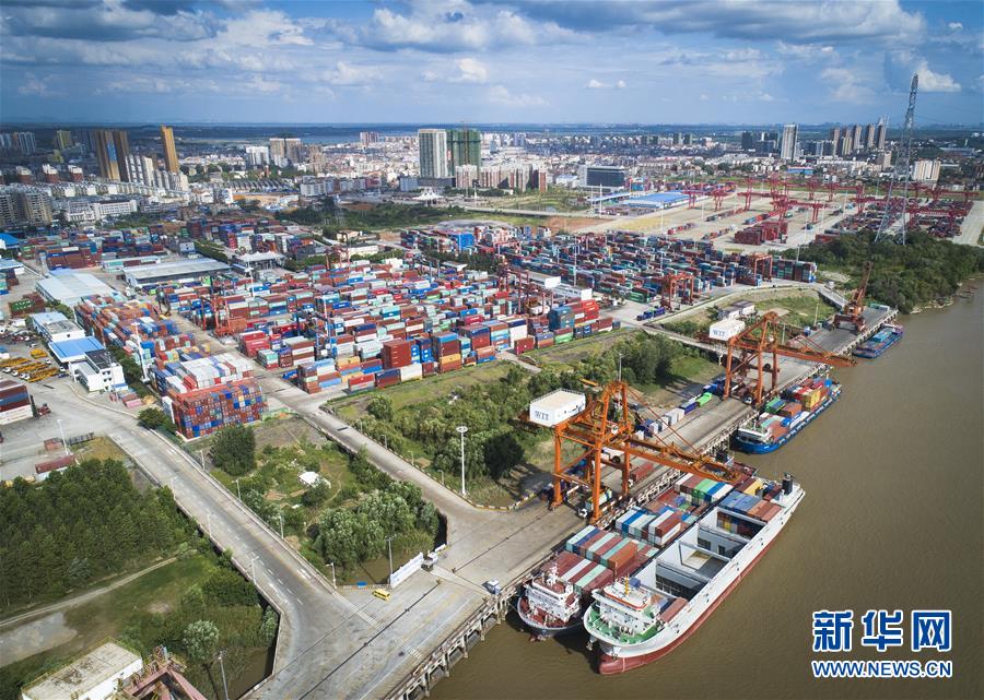 工人在武汉长江中游航运中心核心港阳逻港进行装载作业(8月13日无人机拍摄)。新华社记者肖艺九摄 图片来源:新华网