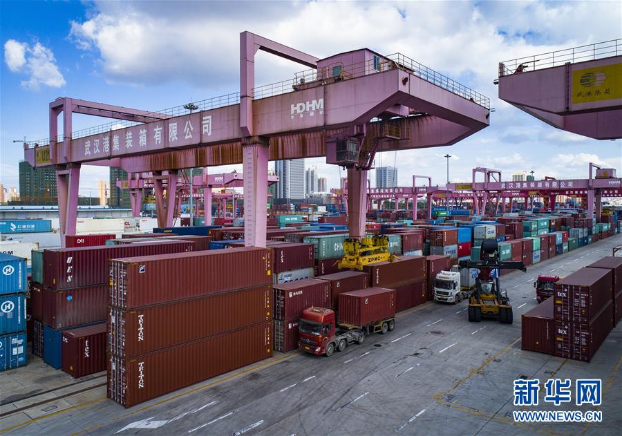 工人在武汉长江中游航运中心核心港阳逻港进行装载作业(8月13日无人机拍摄)。新华社记者肖艺九摄 图片来源:新华网