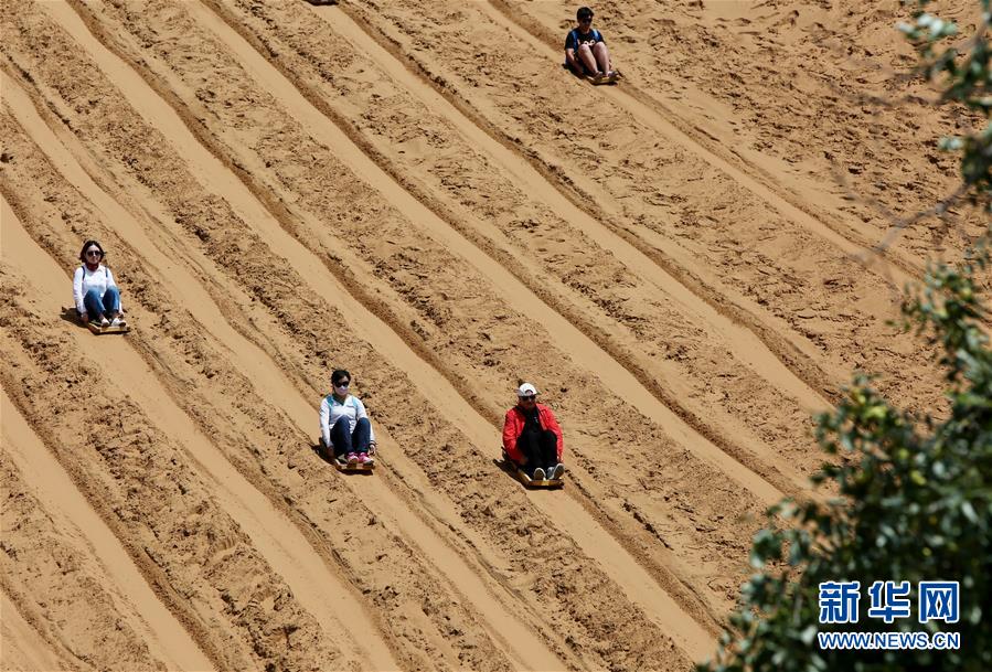 8月22日,游客在中卫市沙坡头旅游景区体验滑沙。沙坡头旅游景区因地制宜发展沙漠旅游,旺季日接待游客量达两万人次。新华社记者伍婧丹 摄