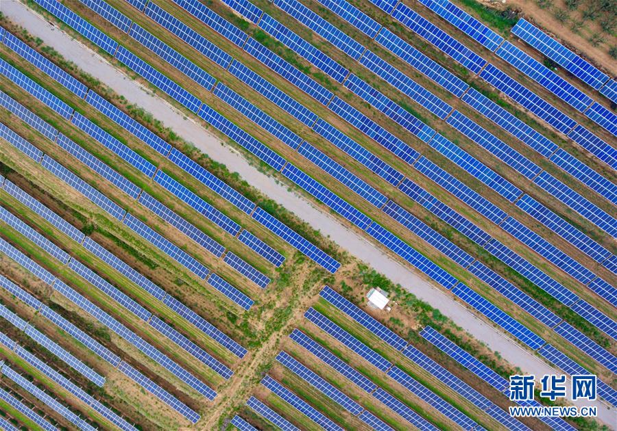 这是7月5日拍摄的山西省运城市芮城县光伏领跑技术基地(无人机拍摄)。近年来,山西省运城市芮城县依托荒山坡地优势,加快发展光伏发电。由国网山西省电力公司、中能建山西电力勘测设计院等共同建设的芮城县光伏领跑技术基地一期项目已全部并网发电,二期项目即将开工建设。该项目总投资88亿元,占地面积近4万亩,总装机容量达102万千瓦。新华社记者曹阳 摄