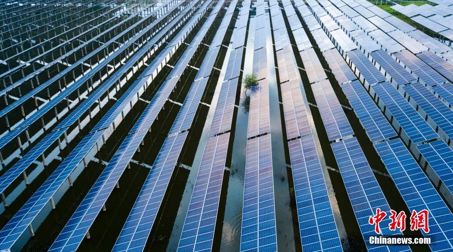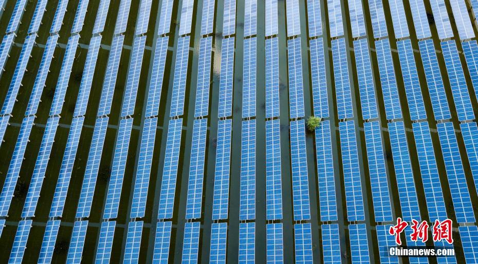 5月17日,江西省新余市分宜县70兆瓦“渔光互补”光伏电站气势恢宏,周边滩涂湿地引来鱼跃鸟飞,景致如画。当地利用电厂2000多亩废弃灰坝,投资6亿元人民币建起“渔光互补”光伏电站并实现并网发电。往昔煤灰堆积的灰坝成为一处和谐绿色的生态休闲之地。中新社记者 王剑 摄