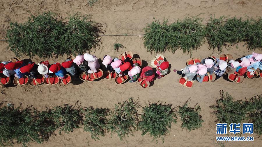红寺堡生态移民区的移民在百瑞源枸杞种植基地排队将采摘的枸杞称重(5月30日无人机拍摄)。近日,在宁夏吴忠市红寺堡区百瑞源枸杞种植基地,头茬枸杞迎来采摘收获季。今年头茬枸杞采摘期比往年提前20天左右。据了解,该基地地处红寺堡生态移民区,占地3000亩,采摘季节每天有数百名当地移民在田间采摘劳作。新华社记者王鹏 摄