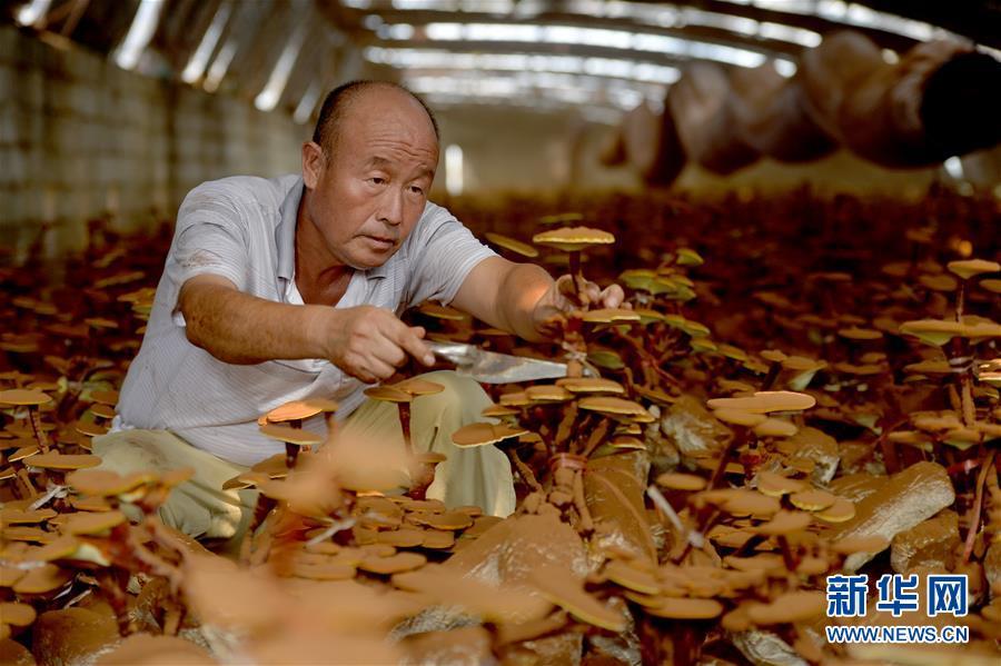 8月22日,河北省沙河市蝉房乡水磨头村农民在大棚内管理种植的灵芝。 新华社记者 牟宇 摄