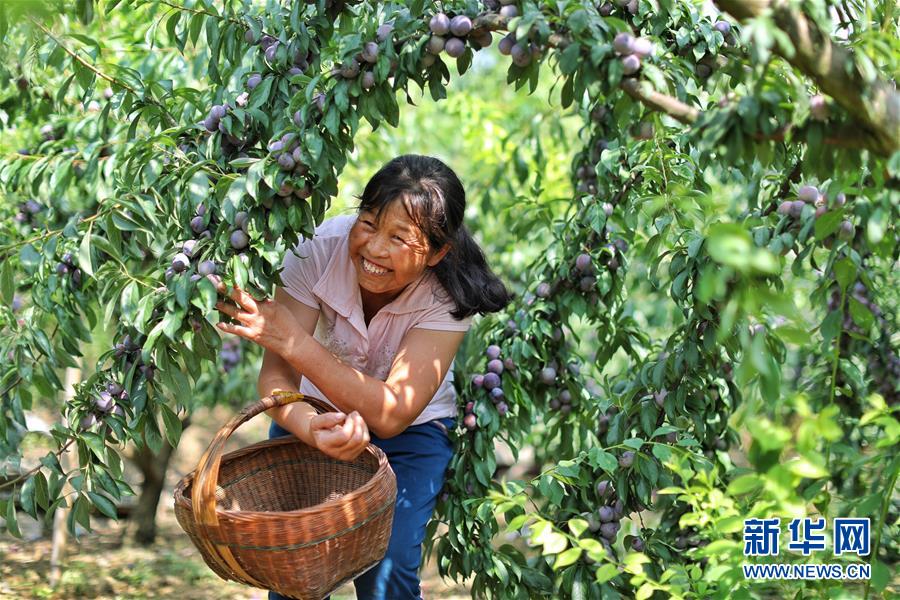 8月12日,平正乡红心村的一名果农在采摘李子。 新华社记者 刘续 摄