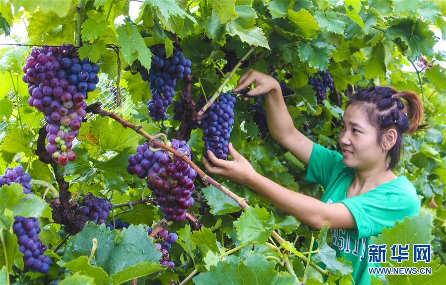8月14日,在河北永清县三圣口乡冰窖村,游客在采摘葡萄。