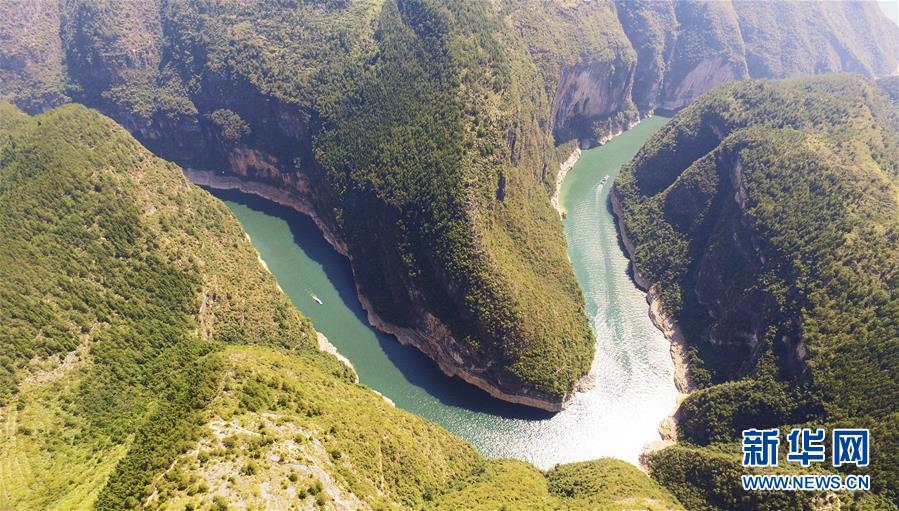 8月29日无人机拍摄的重庆巫山小三峡鱼头湾景色。鱼头湾位于长江支流大宁河流域的重庆市巫山县小三峡滴翠峡,因形似鲢鱼头而得名。初秋时节,鱼头湾一带漫江碧透、景色如画。 新华社记者王全超 摄