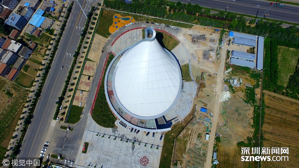 2018年6月13日,航拍河南淮阳一座即将竣工落成的体育场馆建筑,市民称酷似一个石磨盘。