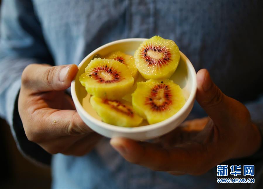 8月30日,庐山市海会镇彭山村建档贫困户陈明芳在葳葳种植专业合作社基地内展示刚刚采摘的红心猕猴桃。 新华社记者尹炣摄