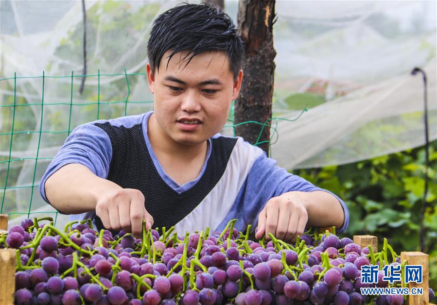 8月14日,在河北永清县三圣口乡冰窖村,农民在打理刚刚采摘的葡萄准备出售。