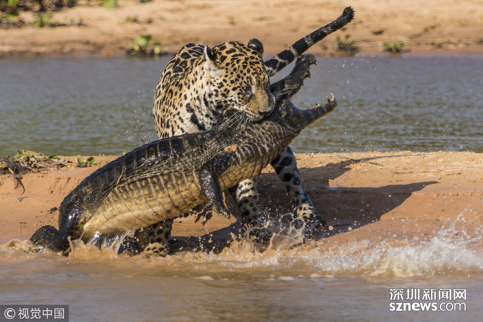 当地时间2013年8月25日,巴西潘特纳尔,一头雄性美洲豹攻击了一条巴拉圭凯门鳄并与之缠斗。这只美洲豹预先躲在水中匍匐前进,然后突然出现把这只鳄鱼震住,随后用牙刺进鳄鱼的坚硬的外壳中,将其拖入丛林……
