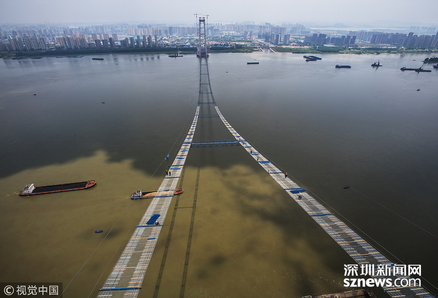 2018年5月14日,武汉,武汉杨泗港长江大桥上空,上部结构施工进入猫道面网铺设阶段,数十名中铁大桥局工人在跨江高空拼搏赶超,江面上空的临时“吊桥”悄然形成。数十名工人在长江上空228米处拼搏赶超,临时“天梯”悄然形成。