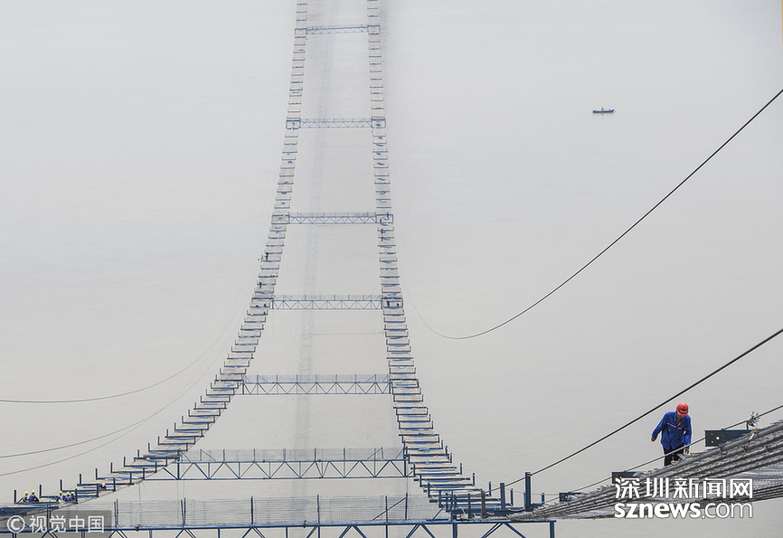 14日11时许,记者在228.8米高空建设现场感受到,高空风力在6级上下,中跨、边跨施工便道现场一片忙碌景象:班组长雷承易带着10余名工人或在用扳手锚紧猫道面网的扶手绳,或在铺设铁丝防护网……
