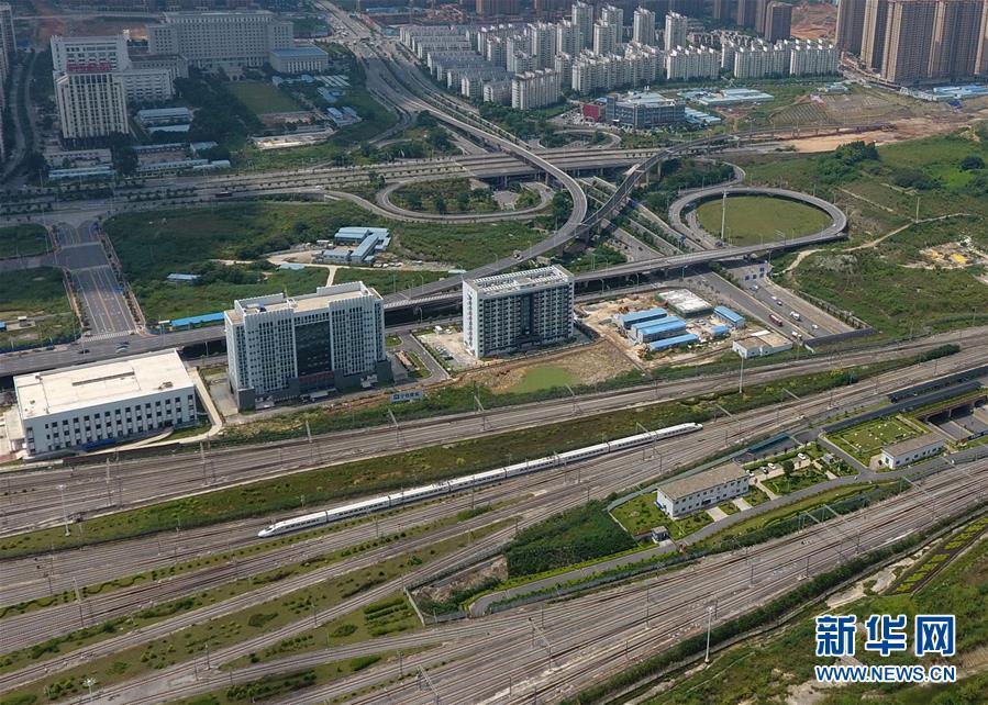 一列动车在南宁市区行驶(9月4日无人机拍摄)。广西壮族自治区成立60年来,铁路建设发生翻天覆地的变化。来自中国铁路南宁局集团有限公司的数据显示,1958年广西铁路总里程为1346.3公里,如今广西铁路总里程达5191公里。广西与周边相邻省份间实现动车“公交化”开行。此外,北部湾港—重庆班列、东盟海产品冷链班列、“百色一号”果蔬专列等的开通和运营,强化了铁路供给的针对性和有效性。铁路成为助推广西经济社会快速发展的“大动脉”。新华社记者陆波岸摄