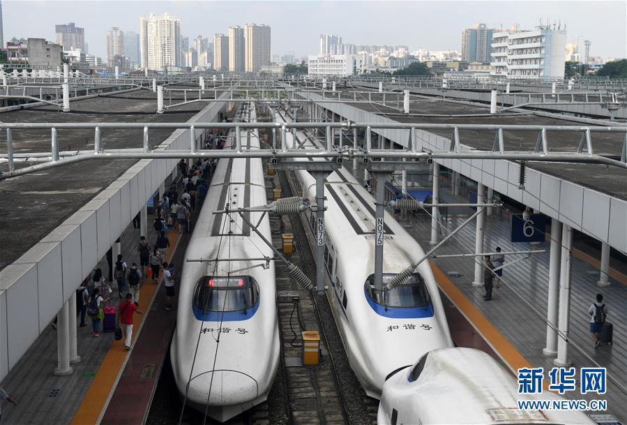 在广西南宁站,旅客进入站台准备乘坐动车出行(9月4日摄)。广西壮族自治区成立60年来,铁路建设发生翻天覆地的变化。来自中国铁路南宁局集团有限公司的数据显示,1958年广西铁路总里程为1346.3公里,如今广西铁路总里程达5191公里。广西与周边相邻省份间实现动车“公交化”开行。此外,北部湾港—重庆班列、东盟海产品冷链班列、“百色一号”果蔬专列等的开通和运营,强化了铁路供给的针对性和有效性。铁路成为助推广西经济社会快速发展的“大动脉”。新华社记者陆波岸摄