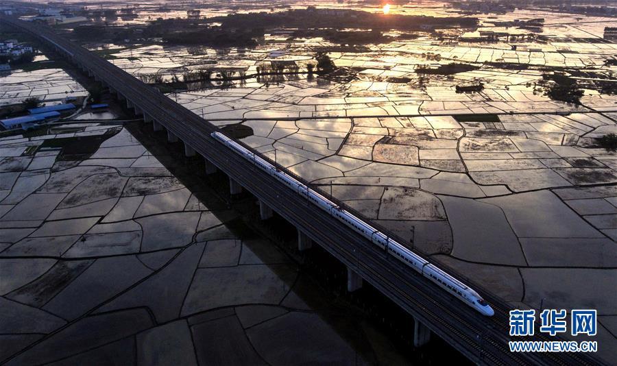 动车在广西宾阳县的田野上行驶(2017年4月1日无人机拍摄)。广西壮族自治区成立60年来,铁路建设发生翻天覆地的变化。来自中国铁路南宁局集团有限公司的数据显示,1958年广西铁路总里程为1346.3公里,如今广西铁路总里程达5191公里。广西与周边相邻省份间实现动车“公交化”开行。此外,北部湾港—重庆班列、东盟海产品冷链班列、“百色一号”果蔬专列等的开通和运营,强化了铁路供给的针对性和有效性。铁路成为助推广西经济社会快速发展的“大动脉”。新华社记者黄孝邦摄