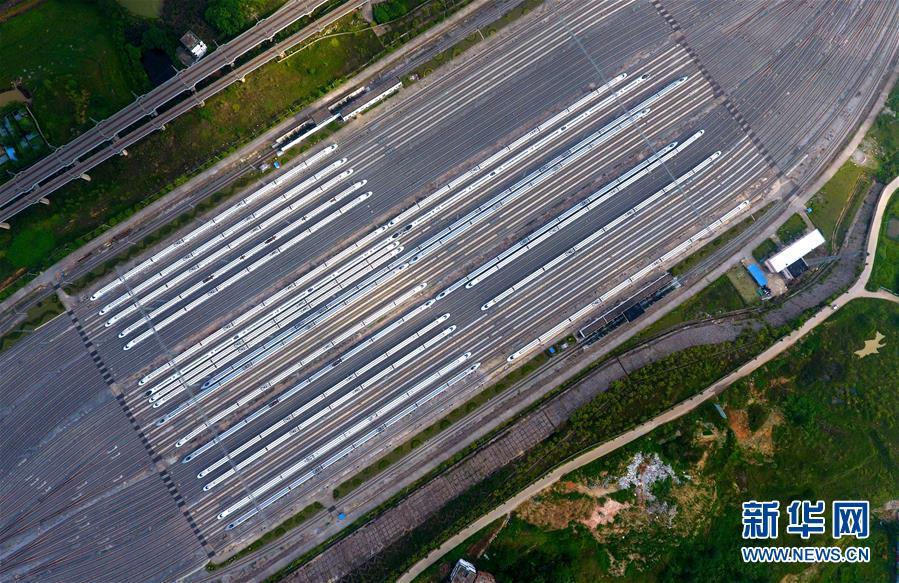 这是广西南宁动车所内准备发往各地的动车组列车(7月1日无人机拍摄)。广西壮族自治区成立60年来,铁路建设发生翻天覆地的变化。来自中国铁路南宁局集团有限公司的数据显示,1958年广西铁路总里程为1346.3公里,如今广西铁路总里程达5191公里。广西与周边相邻省份间实现动车“公交化”开行。此外,北部湾港—重庆班列、东盟海产品冷链班列、“百色一号”果蔬专列等的开通和运营,强化了铁路供给的针对性和有效性。铁路成为助推广西经济社会快速发展的“大动脉”。新华社记者黄孝邦摄