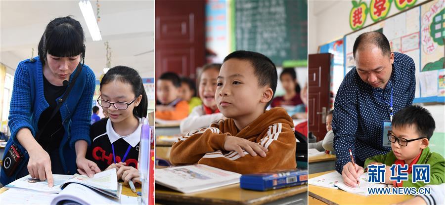 这是一张拼版照片,左图为:在广西南宁市马山县白山镇合群初中,温华芬老师在课后辅导学生功课(4月10日摄);中图为:在马山县白山镇同富小学,侯宇宸在听课(4月10日摄);右图为:在马山县白山镇同富小学,侯瑞良老师在辅导学生功课(4月10日摄)。2017年9月,广东茂名选派优秀教师到广西马山县支教。茂名市电白区木苏中学老师温华芬得知后,与在电白区陈村中学任教的丈夫侯瑞良积极响应,决定带上9岁的儿子侯宇宸共同来到马山县,开展为期一年的支教活动。