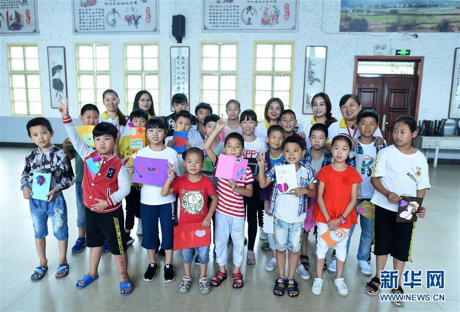 9月8日,戚伯芳(后排右一)及志愿者在团队活动结束后与栗金村留守儿童合影。