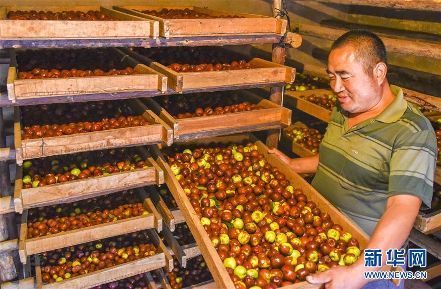 9月22日,河北省枣强县枣强镇孟家庄村的枣农在晾晒红枣。 近日,河北省枣强县的2000多亩枣园迎来收获季,枣农们抢抓农时,采摘、筛选、晾晒红枣,乐享秋收的快乐。 新华社记者李晓果摄