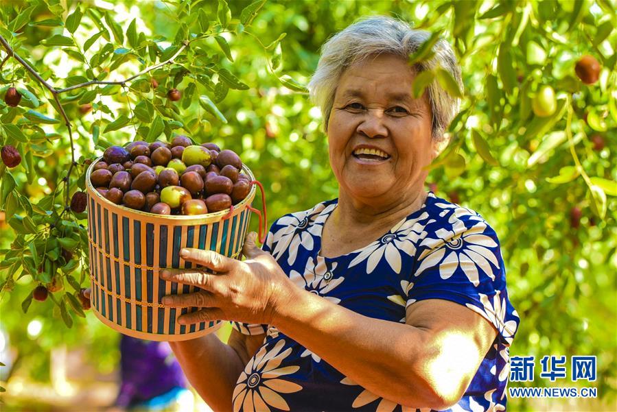 9月22日,河北省枣强县枣强镇孟家庄村的枣农在展示刚刚收获的红枣。 近日,河北省枣强县的2000多亩枣园迎来收获季,枣农们抢抓农时,采摘、筛选、晾晒红枣,乐享秋收的快乐。 新华社记者李晓果摄