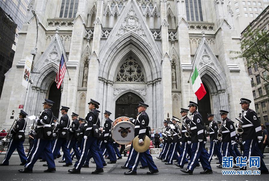 10月8日,在美国纽约曼哈顿第五大道,美国西点军校乐队参加哥伦布日游行。 新华社记者王迎摄