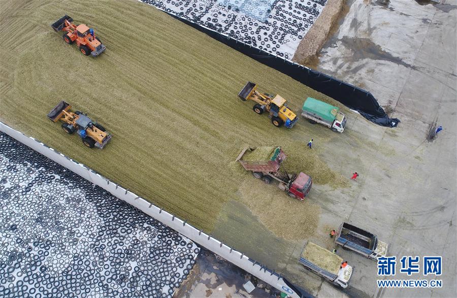 10月8日,工人驾驶机械设备在青贮饲料场作业(无人机拍摄)。 近年来,河北省故城县结合市场需求,通过“龙头企业+基地+农户”的经营模式,鼓励引导农民发展订单式青贮玉米种植,不仅增加了种植户收入,而且为养殖企业提供了优质饲料。目前,故城县已发展青贮玉米种植面积6万余亩。 新华社记者 朱旭东 摄