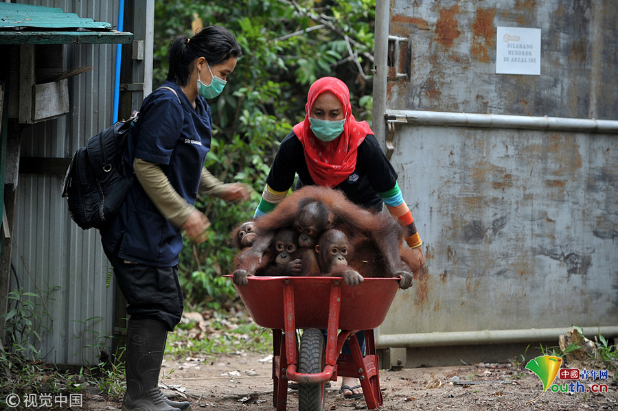 当地时间2018年9月18日,印尼加里曼丹克塔邦,国际动物救援(IAR)猩猩安全与保护中心里,饲养员用独轮车把猩猩宝宝送到森林学校。图片作者:Newscom