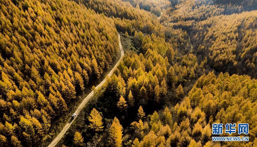 10月8日,一辆汽车行驶在好地方林场的林间道路上(无人机拍摄)。 进入秋季,地处山西省沁源县的好地方林场变成金黄一片,四面眺望,群山环绕,绵延起伏,林海苍茫,宛如一座座金山展现在眼前。 1962年起,好地方林场职工拉开了造林的序幕,攻克落叶松山地育苗等难关,连续20年,共营造落叶松人工林29000余亩。如今的好地方林场森林总覆盖率达98%以上,成为一处“林茂草奇花艳丽”的天然氧吧。 目前沁源全县森林面积220万亩,天然牧坡120万亩,森林覆盖率达56.7%,居山西省第一,是全国天然林保护重点县、全国“油松之乡”。 新华社记者陶明摄