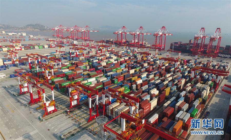 这是上海洋山深水港四期自动化码头(7月25日无人机拍摄)。 位于杭州湾口外的上海洋山深水港区,由大、小洋山等数十个岛屿组成,是中国首个在海岛建设的港口。洋山港西北距上海市南汇芦潮港约32公里,南至宁波北仑港约90公里,距国际航线仅45海里,是距上海最近的深水良港。 得益于洋山深水港的规划建设和多年发展,目前上海港与全球214个国家和地区的500多个港口建立了集装箱货物贸易往来,国际班轮航线遍及全球各主要航区。2017年,上海港集装箱吞吐量首次突破4000万标准箱,完成4023.3万标准箱,同比增长8.3%,均创历史最高水平。 新华社记者 丁汀摄
