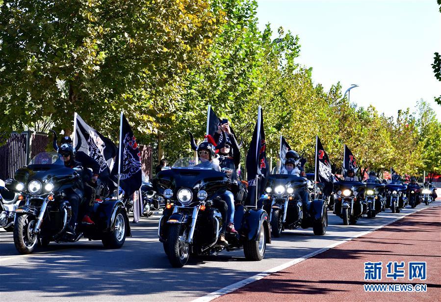 10月10日,骑手们在唐山市南湖公园丹凤朝阳广场出发开始巡游活动。