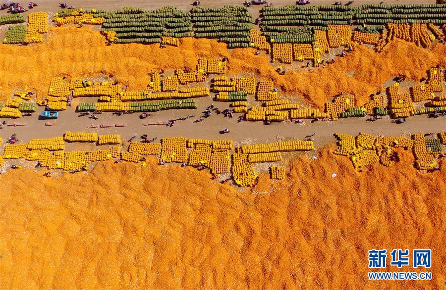 10月14日,河北省南和县闫里乡闫里村农民在晾晒收获的玉米(无人机拍摄)。