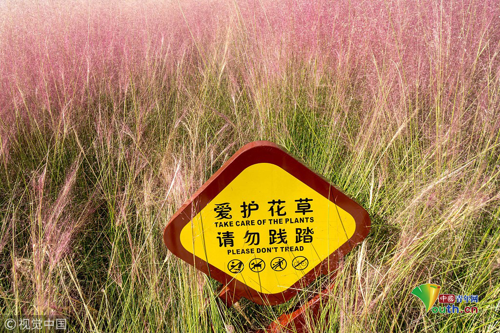 2018年9月28日,上海,东外滩杨浦滨江的粉黛乱子草目前已进入盛花期,当日早间,不少市民来到滨江拍照赏景,成片的紫色花海在蓝天白云映衬下美不胜收。图片作者:王冈/视觉中国