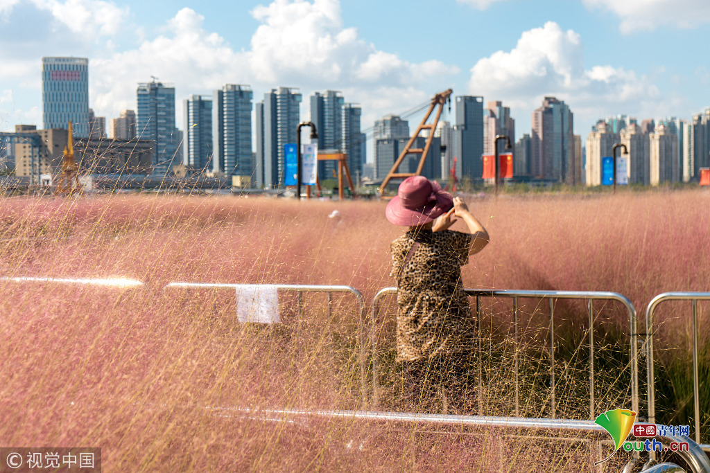 2018年9月28日,上海,东外滩杨浦滨江的粉黛乱子草目前已进入盛花期,当日早间,不少市民来到滨江拍照赏景,成片的紫色花海在蓝天白云映衬下美不胜收。图片作者:王冈/视觉中国