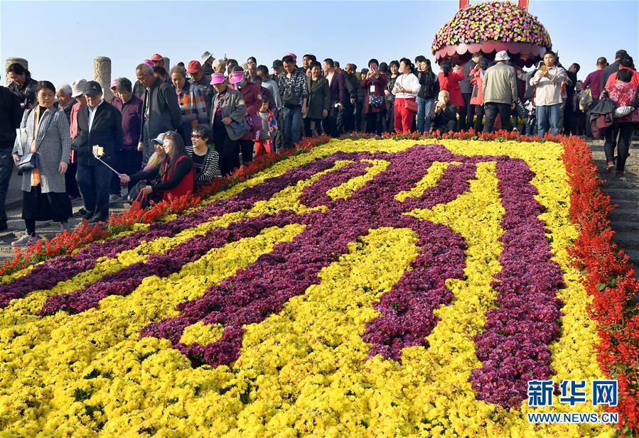 10月17日,游客在开封龙亭公园欣赏菊花。重阳时节,各色菊花竞相绽放,把古都开封装点得分外秀美,吸引众多游客前来观赏游玩。 新华社记者 李安 摄