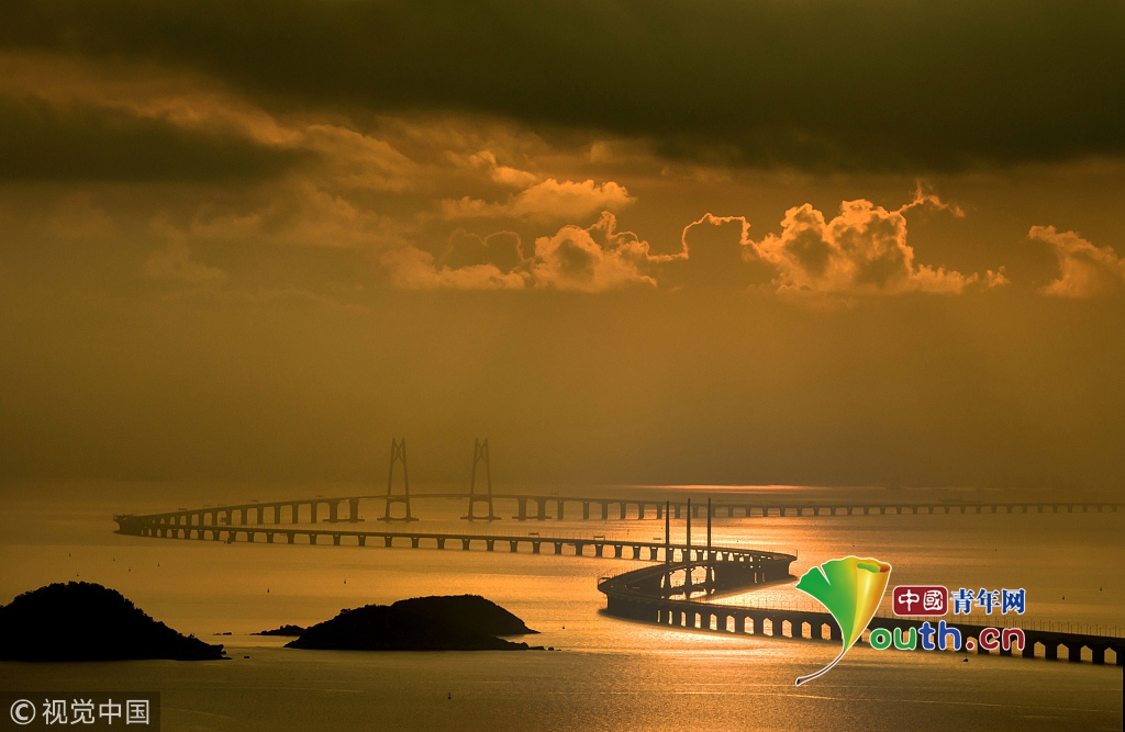 2018年5月21日,广东珠海,太阳从香港大屿山慢慢升起,港珠澳大桥犹如一条巨龙蜿蜒盘绕在海面上。