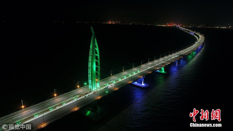 2017年12月30日,珠海,港珠澳大桥九洲航道桥、江海直达船航道桥灯火璀璨,在五颜六色的装饰灯映衬下,整座大桥熠熠生辉。王荣 摄 图片来源:视觉中国