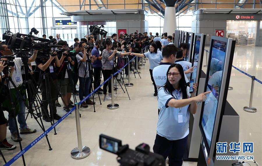 10月19日,在香港口岸旅检大楼,工作人员在穿梭巴士自助售票机前演示购票过程。 港珠澳大桥开通在即。 新华社记者 李钢 摄