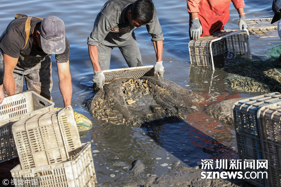 蛏子肉质鲜嫩,外壳薄脆,如果用机器辅助,很容易破坏其完整性,所以,目前主要采用全程的“人海战术”来挖縊蛏,从而确保每天上岸蛏子的质量和产量。