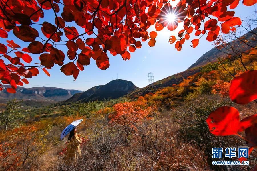 10月24日,游客在河北省武安市贺进镇后临河村观赏红叶。 金秋时节,位于太行山区的河北省武安市贺进镇后临河村的红叶进入观赏佳期。 新华社记者 王晓 摄