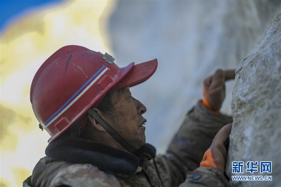 在昆仑山上海拔4000米的兴发达玉矿,工程师田仲祥展示一块正在开采的玉石矿体(10月23日摄)。 新华社记者武巍摄