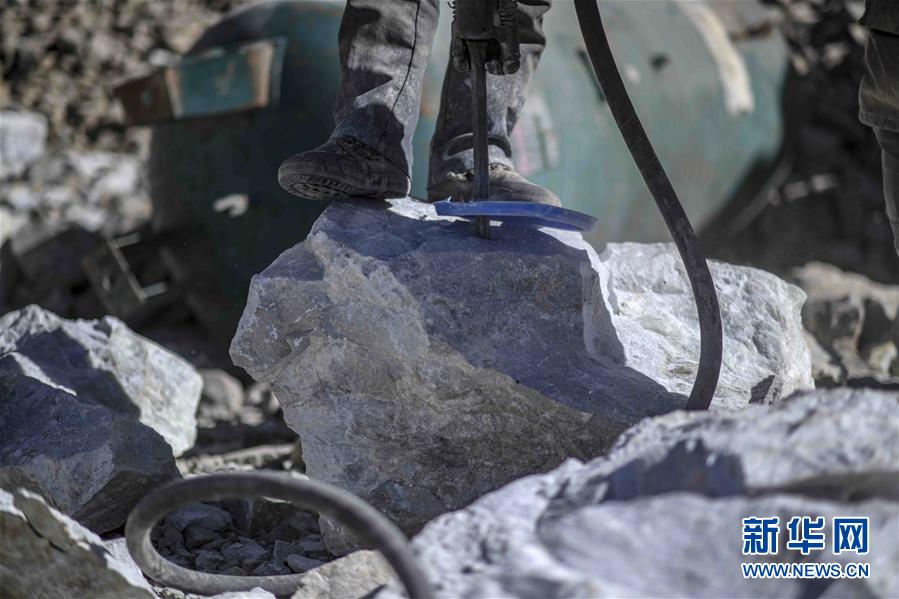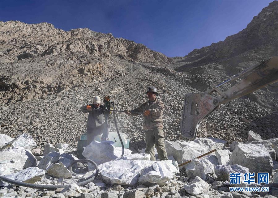 在兴发达玉矿,采玉师傅们正往玉石上打眼,便于观察玉石品质(10月23日摄)。 新华社记者赵戈摄