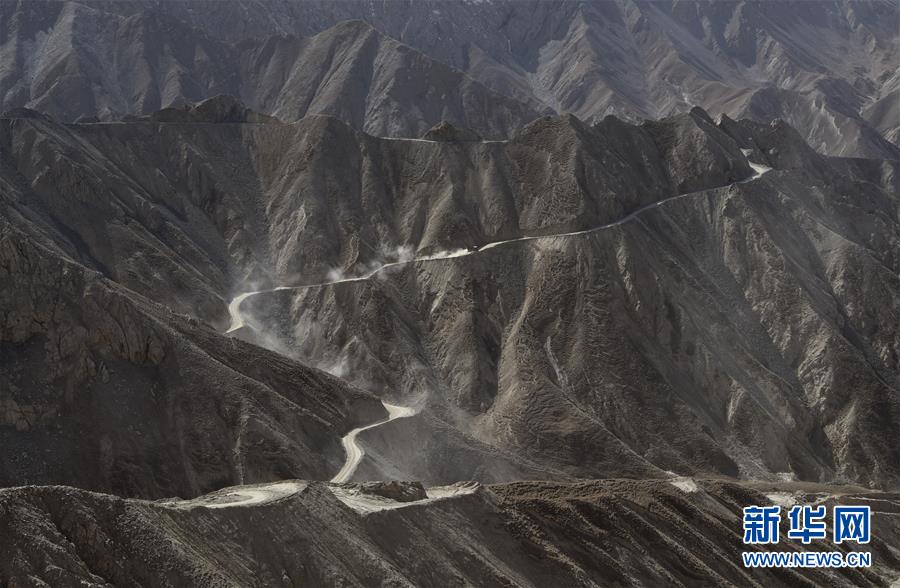 在距离且末县县城160多公里的昆仑山上的兴发达玉矿,可见对面山上运载铜锌矿矿石的卡车行驶在简易矿山公路上(10月23日摄)。 新华社记者武巍摄