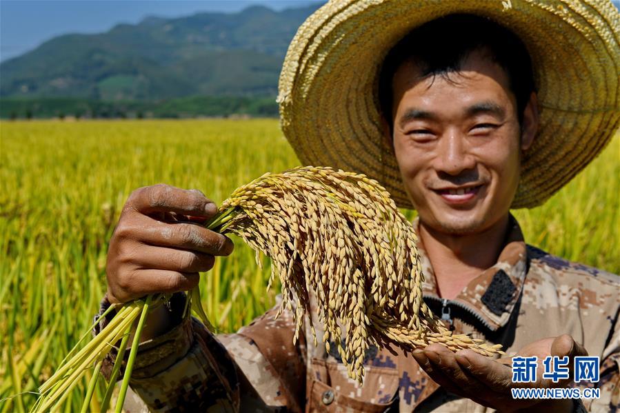 10月31日,武夷山市兴田镇南岸村农民在展示稻穗。