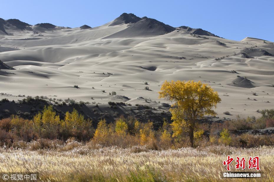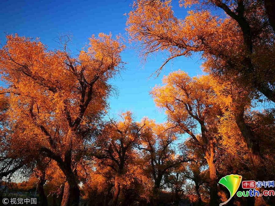 中国青年网北京10月9日电 2018年10月7日至8日,内蒙古自治区阿拉善盟额济纳旗,地处巴丹吉林沙漠。额济纳河两岸壮观的胡杨林堪称大漠的一颗绿色明珠,每年深秋时节的第一场秋霜过后,大片的胡杨树叶由绿变黄,一眼望去,阳光下金色的树叶衬着湛蓝的天空于风中婆娑起舞,鲜明的影调,亮丽的色彩,令人流连忘返。