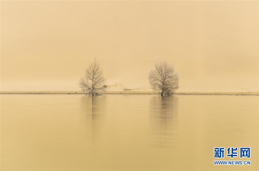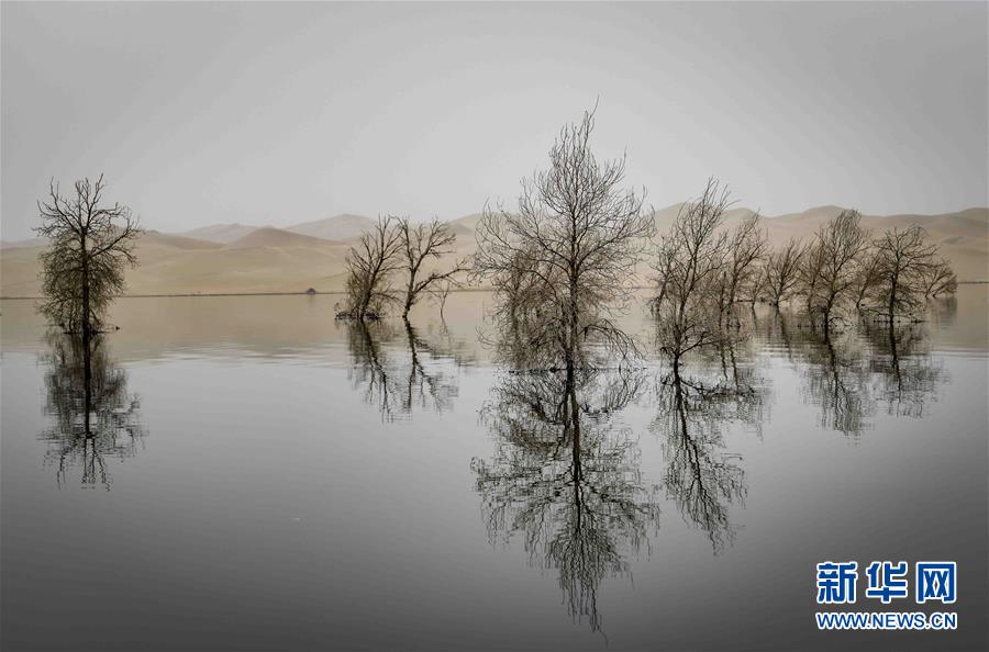 在位于新疆巴音郭楞蒙古自治州尉犁县的一处名叫“罗布湖”的海子里,几棵胡杨的倒影映在水中(10月17日摄)。 新华社记者 赵戈 摄