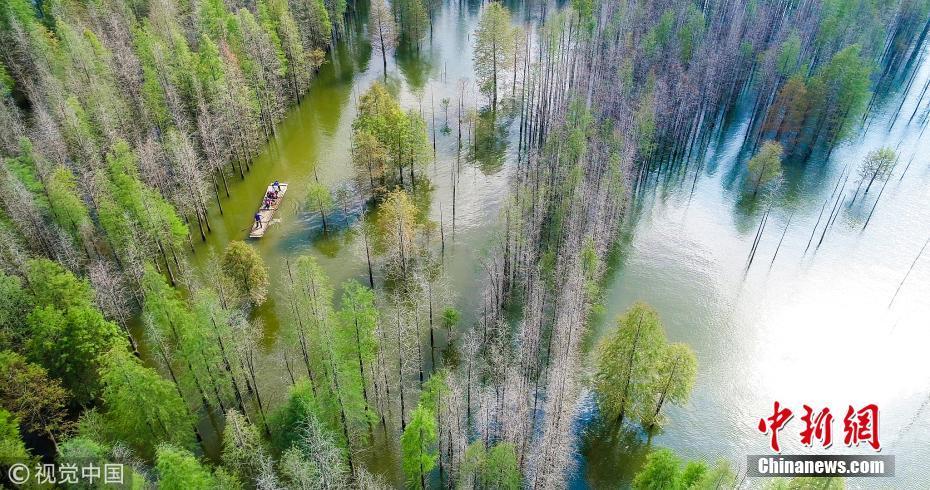 10月5日,航拍安徽宣城宁国方塘乡汪村青龙湖港口湾水库,游客们泛舟湖上,穿梭于红杉林中,享受秋日的美好时光。 图片来源:视觉中国