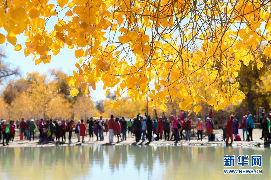 10月10日,在内蒙古自治区额济纳旗,游客观赏胡杨林。 金秋时节,内蒙古自治区额济纳旗胡杨林如同披上金装,成为大漠中的一抹亮色,吸引众多中外游客前来观赏游玩。 新华社记者安希雅摄