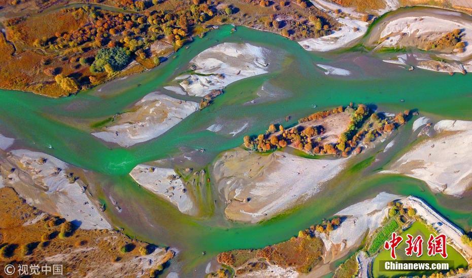 10月5日,新疆巴音郭楞,流过新疆和静县巴润哈尔莫敦镇的开都河秋景(无人机拍摄)。 图片来源:视觉中国