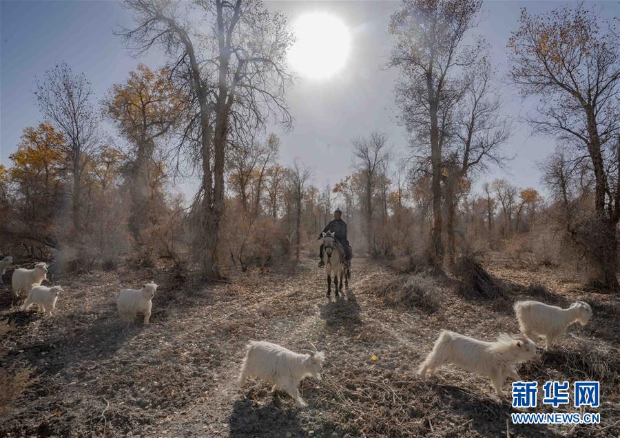在新疆巴音郭楞蒙古自治州尉犁县喀尔曲尕乡的胡杨林里,牧羊人马木提·买买提在放羊(10月25日摄)。 新华社记者 赵戈 摄